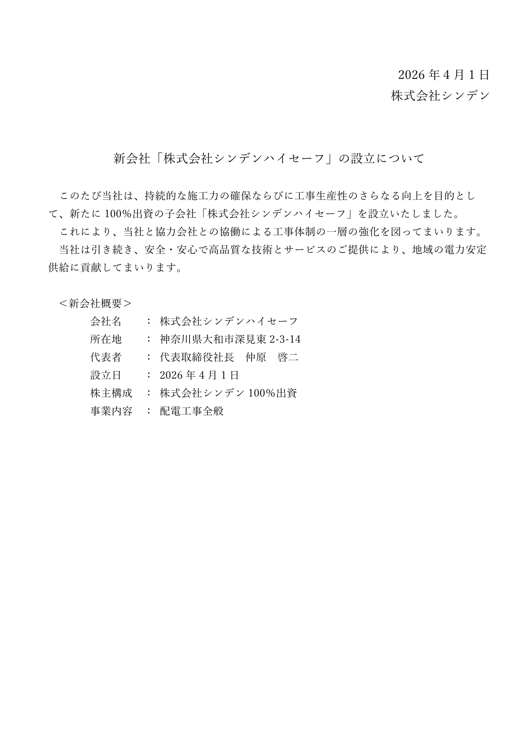 「株式会社シンデンハイセーフ」の設立について