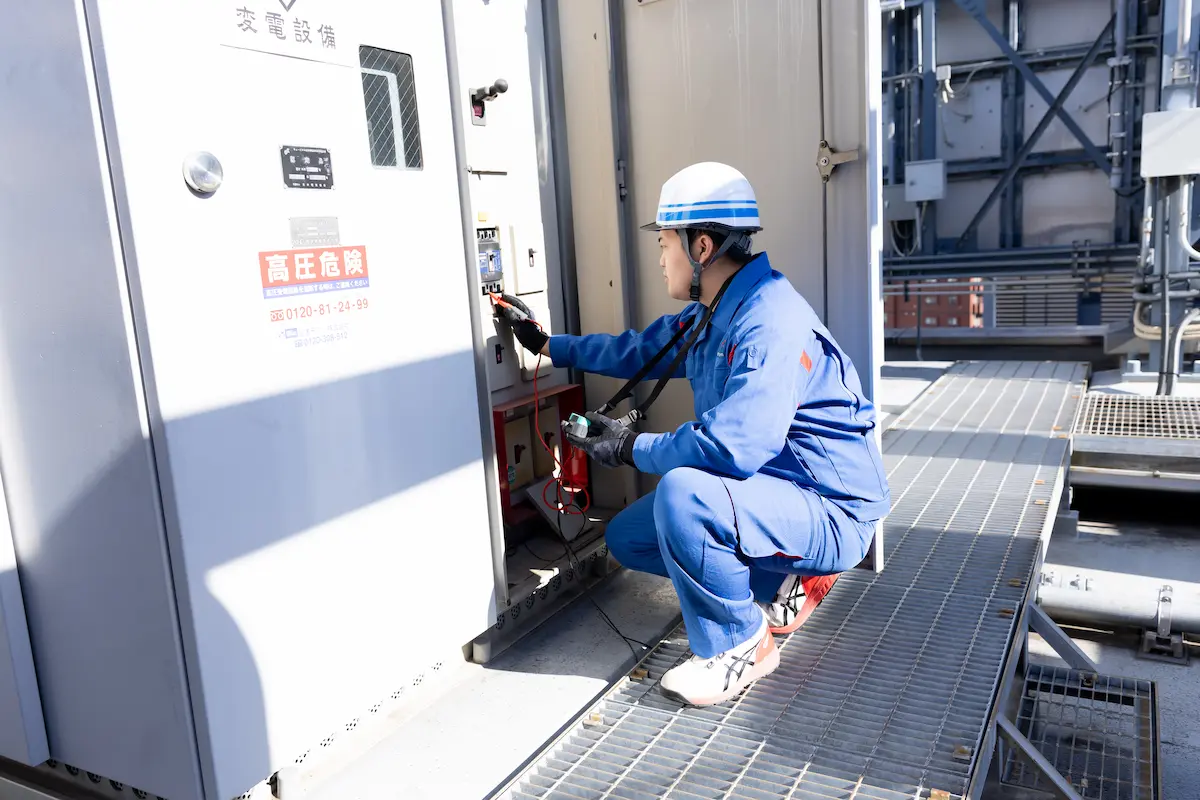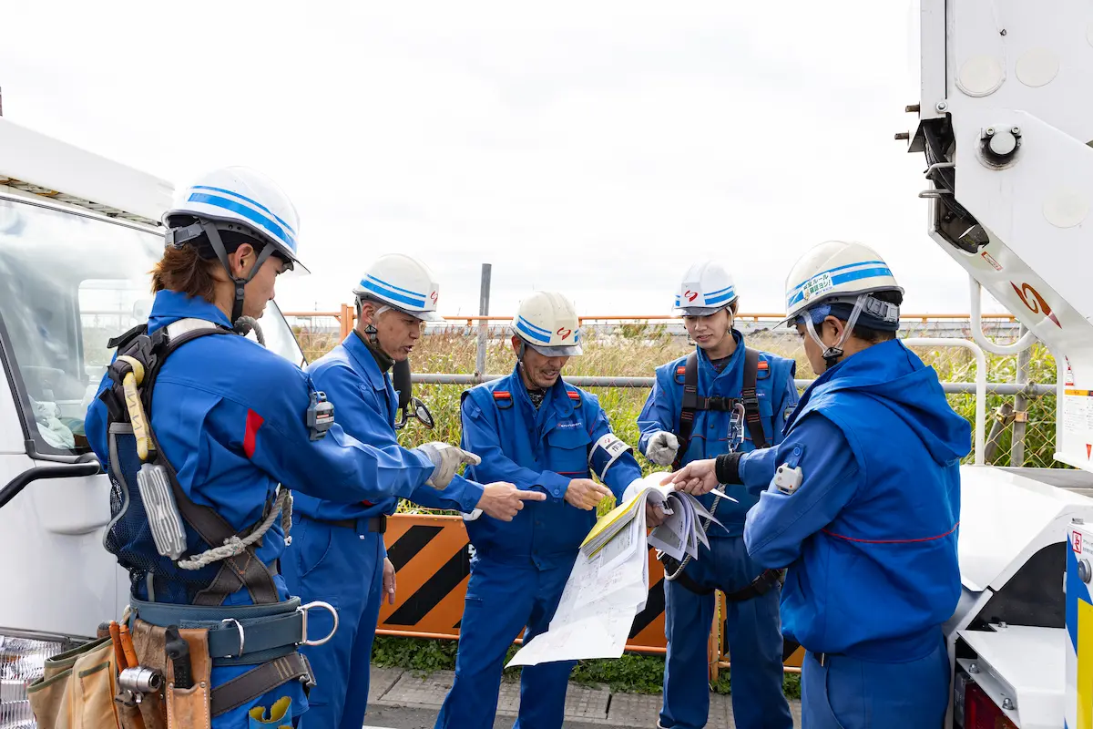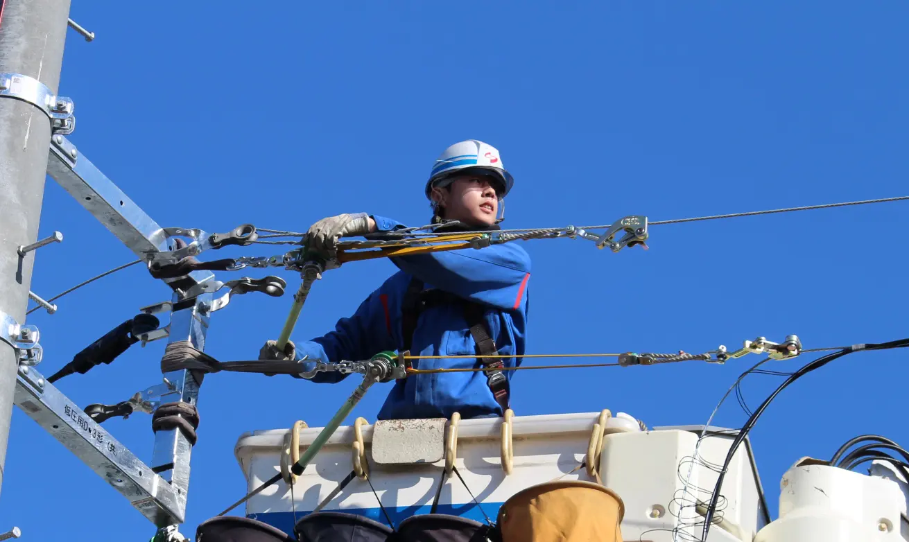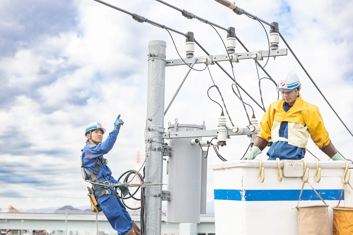 東京電力の配電設備をメンテナンスする仕事です。電線を張り替える、電柱上の設備を取り替えるなど、地域の電気設備を構築し守っています。